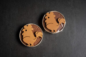 Poule de Pâques garnie d'un assortiment gourmand de friture de Pâques et de petits œufs pralinés noisette.